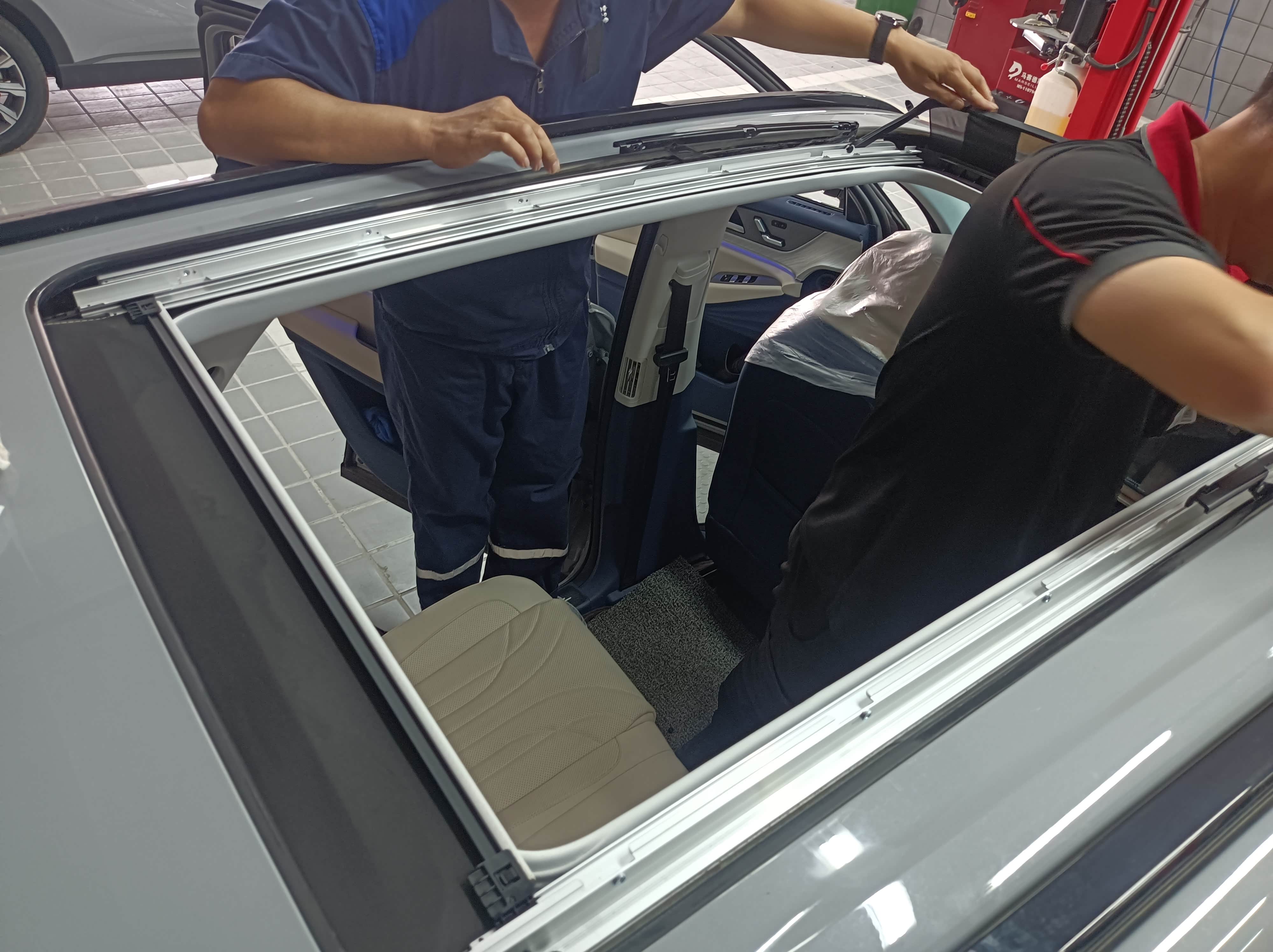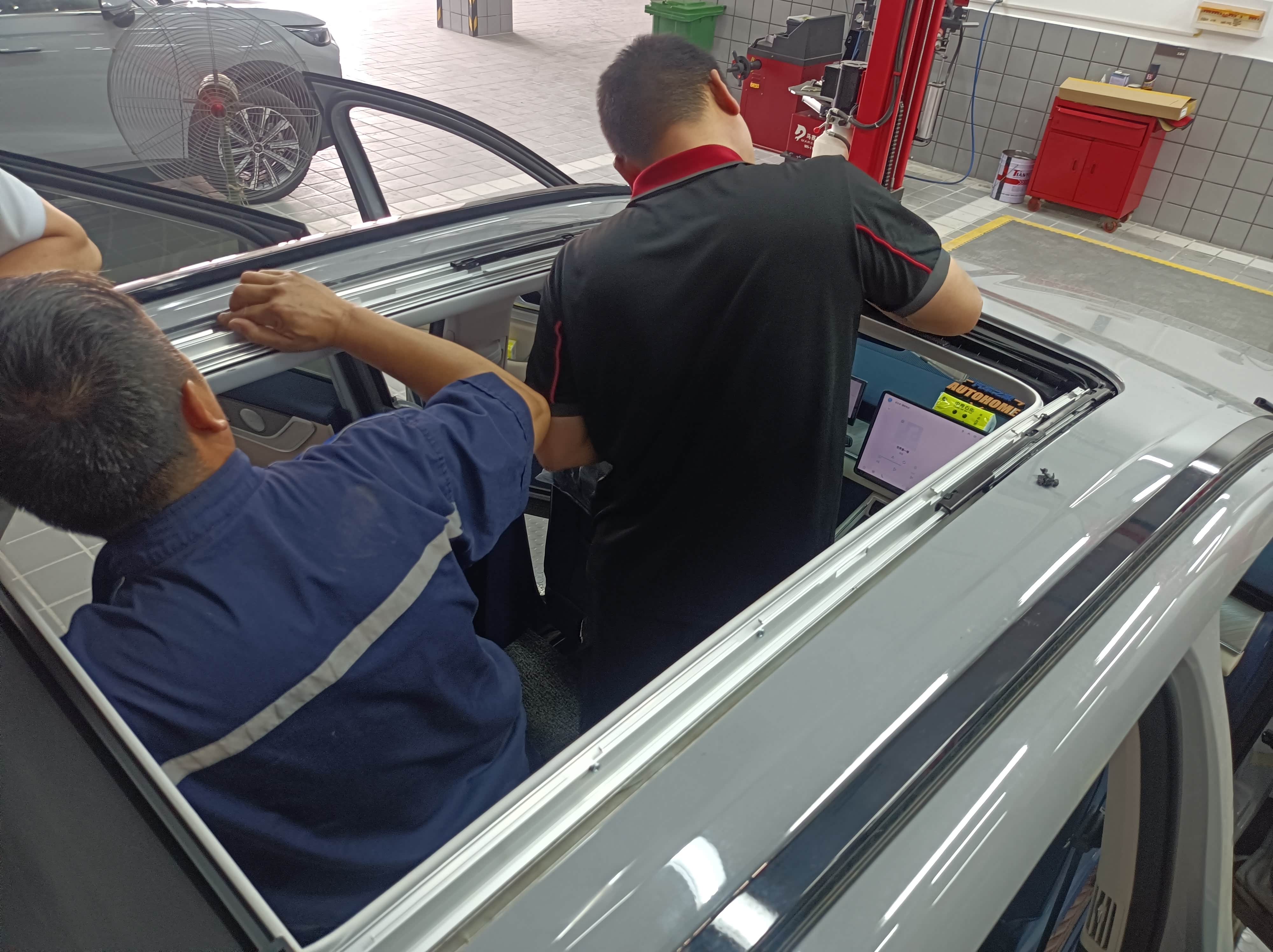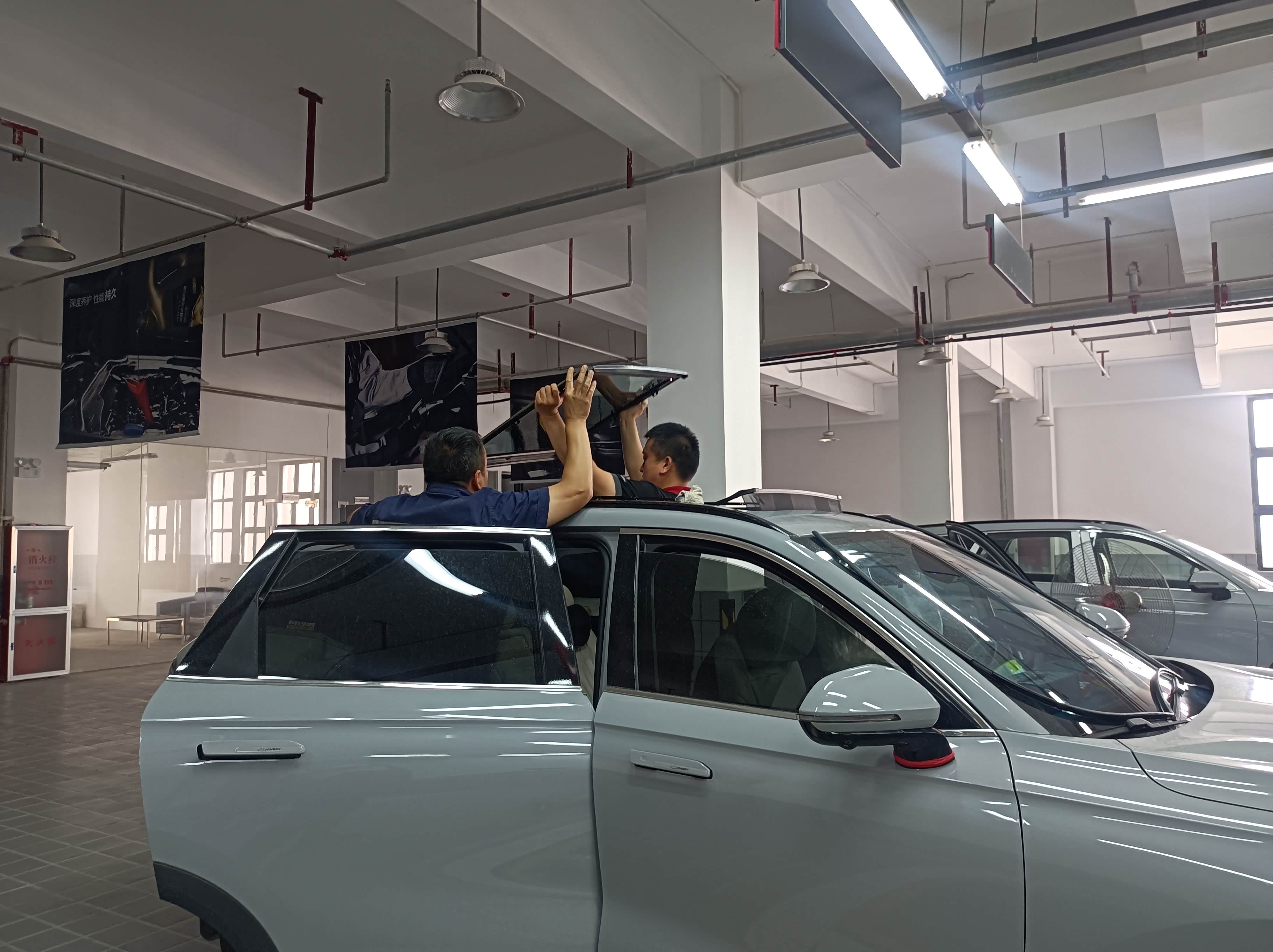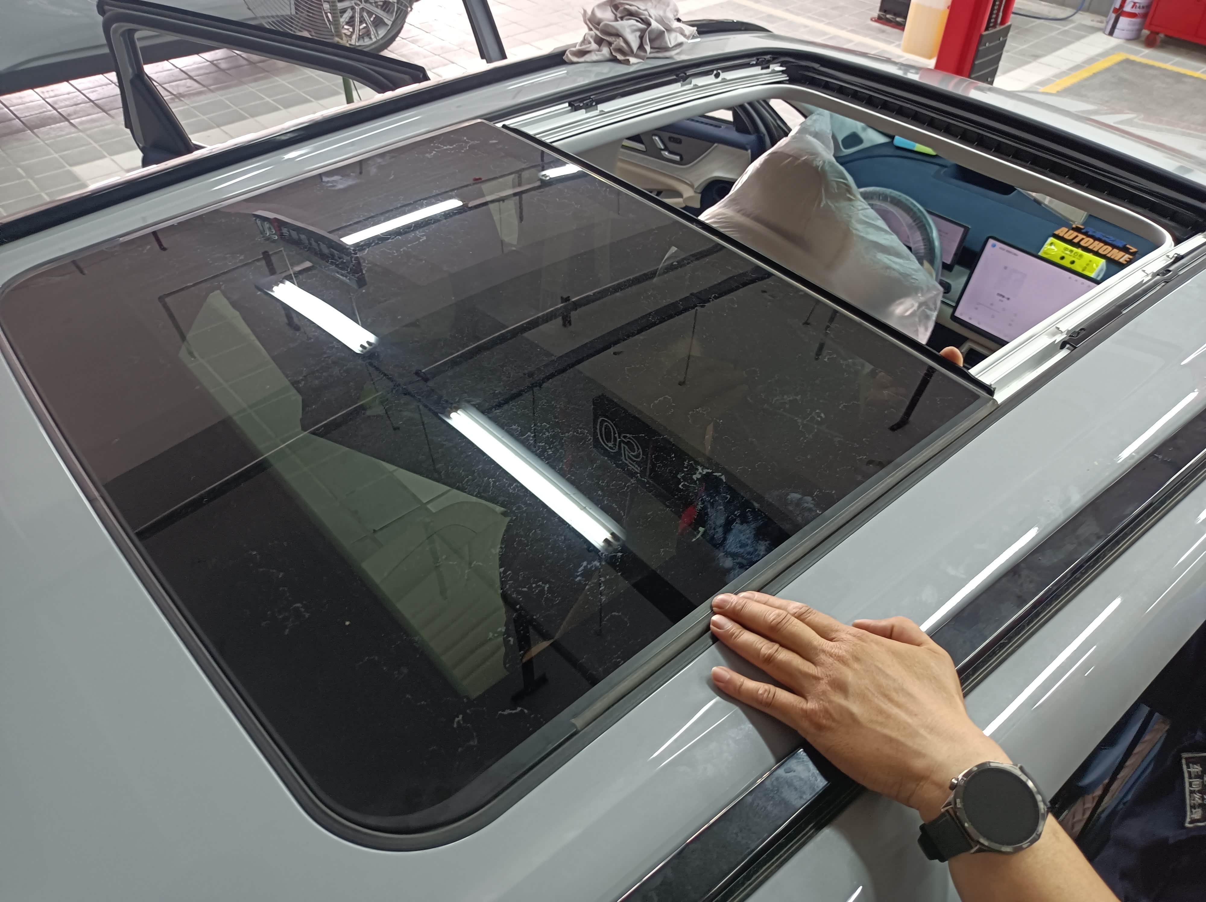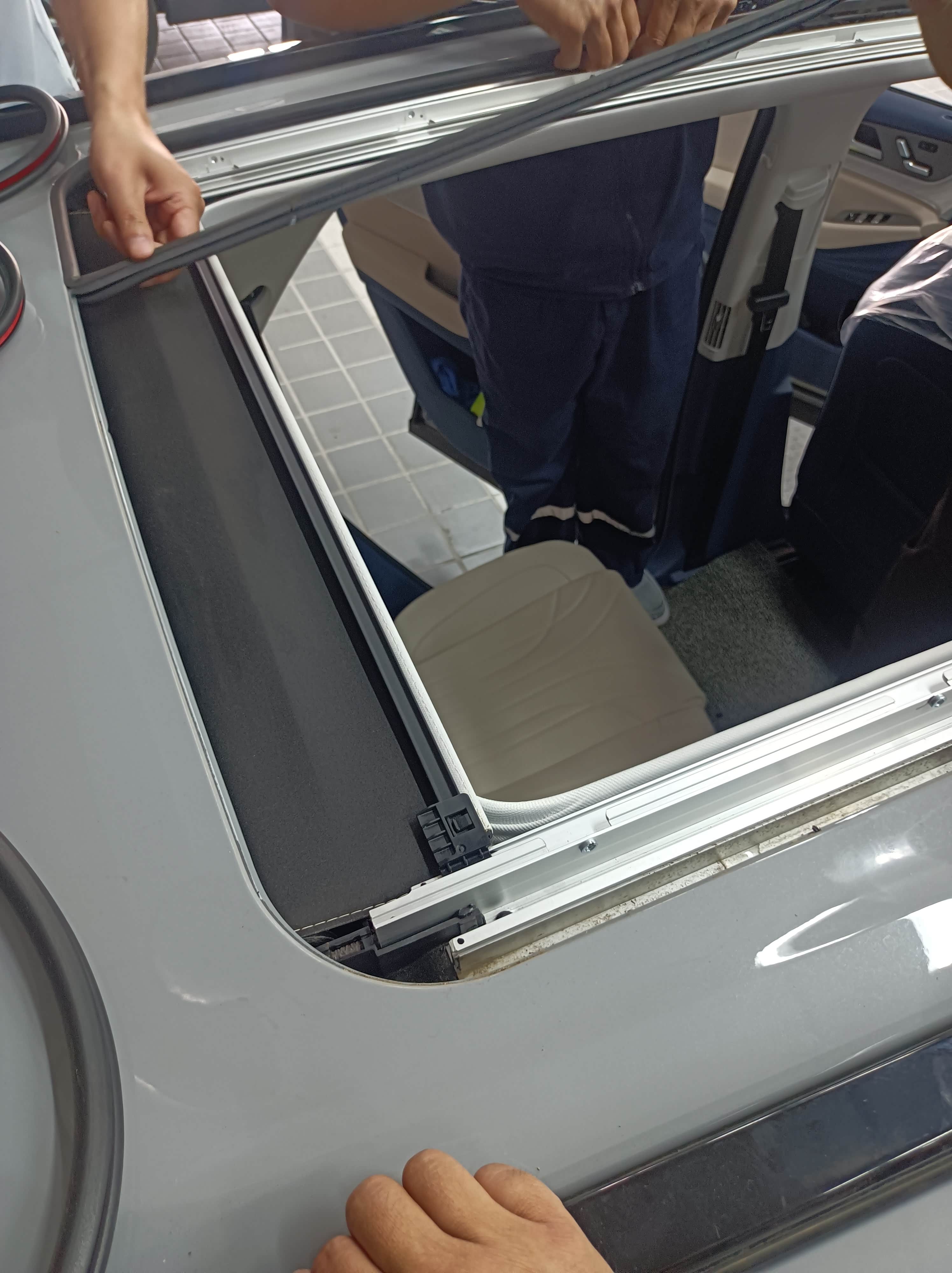 两位师傅先放上面,比一比,大小确实一样,看来是跟星途的天窗通用的。