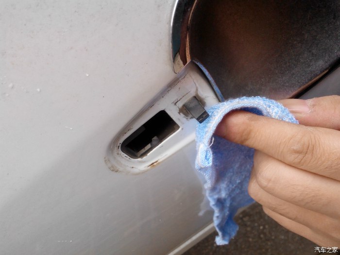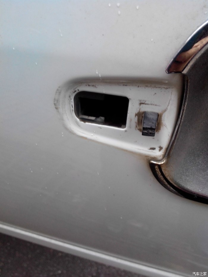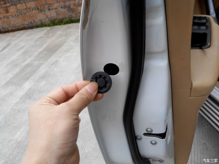 首先把这个堵口撬出来,这个不是蛮好撬,用起子会伤到漆,没办法只能用起子,这个我已经补了漆的。打开这个孔你就能发现那个螺丝了,跟下方锁勾子那里三个是一样的,把内六角伸进去慢慢拧,等要松完的时候要小心了,千万别掉进去,不然你懂的。