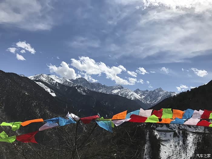 巴朗山东面卧龙大雪塘雪山。经幡猎猎,雪山巍峨。