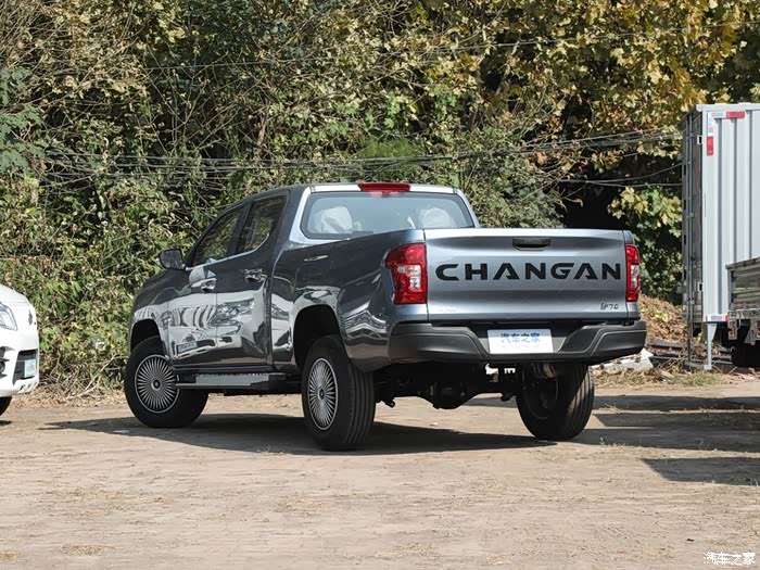 车侧相比车头更具实用属性,时尚感略减。轮圈采用常规样式,货箱尺寸较大,预计有不错的装载能力。车尾有"CHANGAN"标识,头灯组纵置布局,后包围配有宽大黑色护板,标准的皮卡外观。