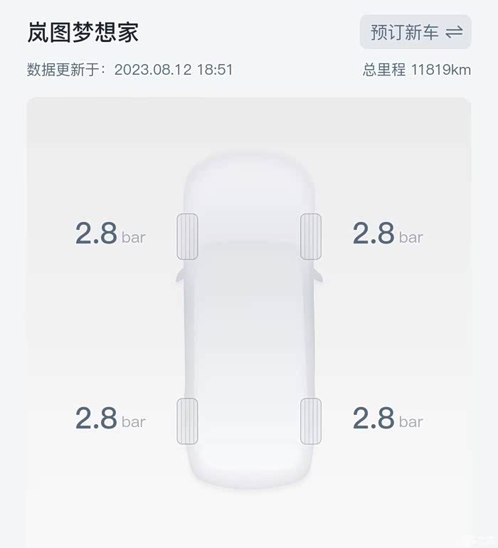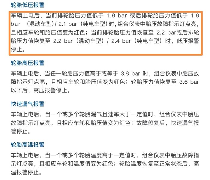 关于新能源车辆有大电池的装载,对胎压的要求也不尽相同。根据梦想家用户手册记载,当前轮胎压低于1.9,车辆会发出低压报警,混动车型后轮低于2.1,车辆会发出低压报警;而纯电车型后轮则是低于2.4开始报警。
