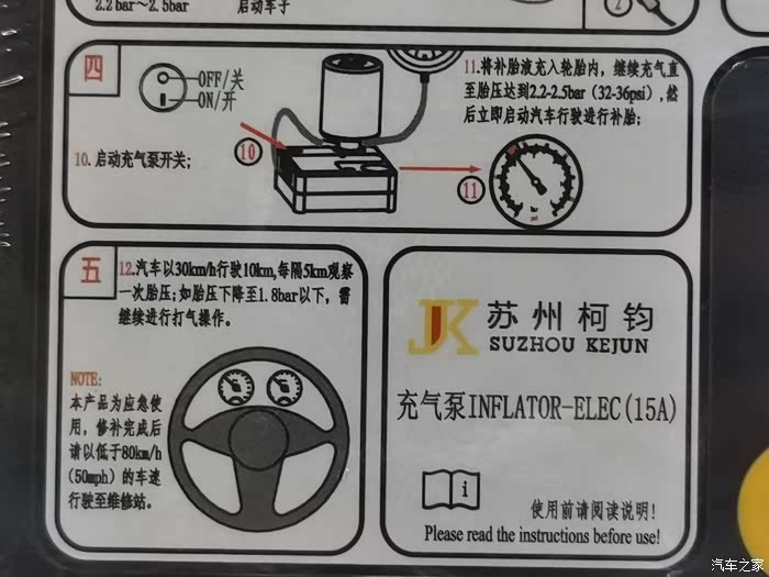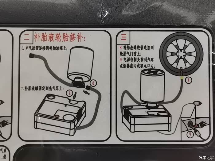 我知道岚图给车辆随车配置了电动充气泵,于是乎我从后备箱拿出了这两样东西,一个充气泵和一罐补胎液。这两件临时救援宝物真没用过,都还没拆封呢,不知算不算幸运呢。经仔细研究,以后遇事也不必惊慌了。