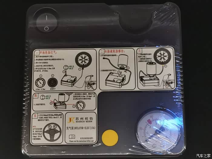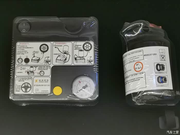 首先,这个电动充气泵用有个作用,一是单独给轮胎打气,二是结合补胎液进行轮胎修补。打气泵的电源取自车辆12V的点烟器接口,如果要进行轮胎修补,需要在轮胎打气之时接上补胎液的罐子,再把补胎液罐子的另一端接入轮胎的气嘴,当胎压打到2.2-2.5时,需要开动车辆完成补胎。