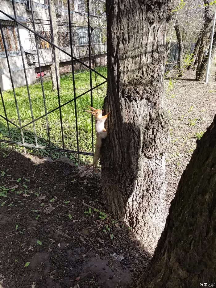 出青旅第一件事找地方换钱,经过一条人工河走在树林(进入哈国一直都是戈壁滩,但是很神奇出了青旅印入眼帘的是阿拉木图远处的青山绿水,还有覆盖率挺高的植被)一只不知道什么品种的松鼠爬在树上离我们很近,看不出有跑的意思,心想在国内早被抓了。