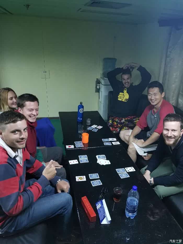 中午几名小伙伴一起闲转聊天,探索船上的一切能到达的地方。没有人因为停船而显得着急。里海的日落真么很美,晚饭后大家围坐在一起,玩一个名叫“你好”的中文名扑克游戏,很有意思其实就是咱们玩的“斗牛”叫法不一罢了。没有人因为停船而显得着急。