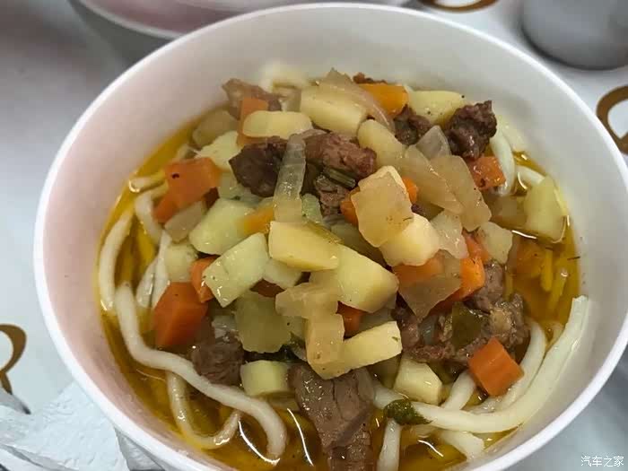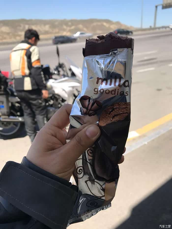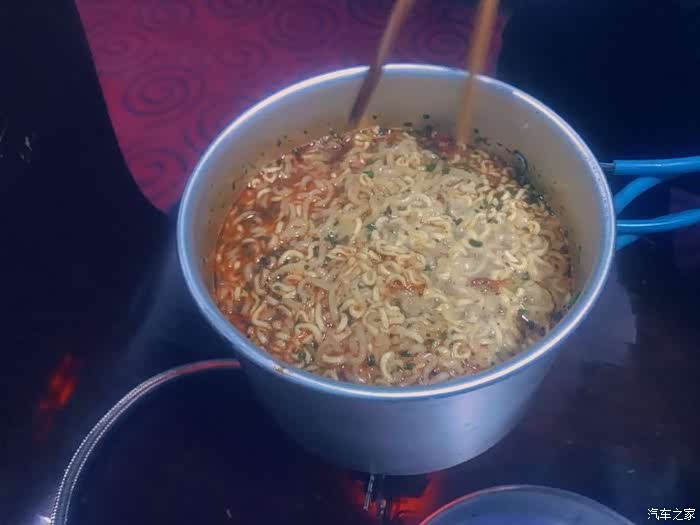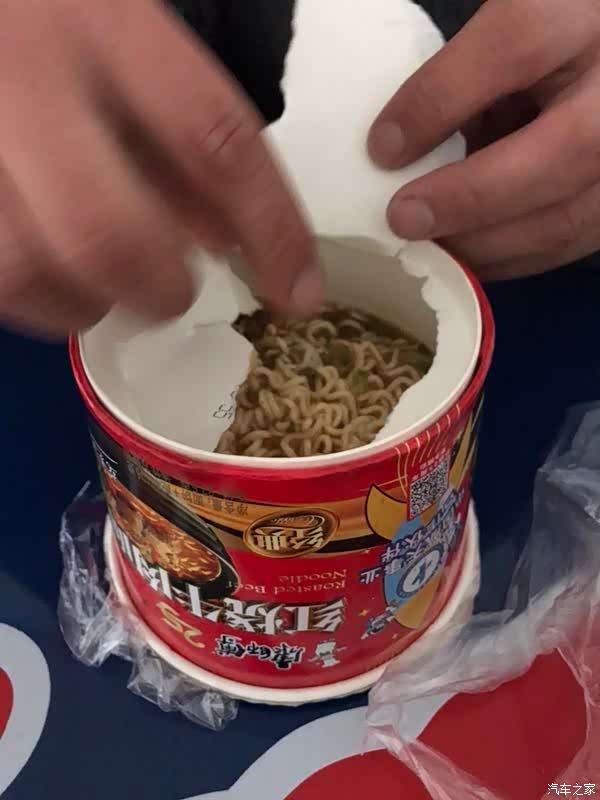 在到达赛里木湖服务区后,我俩已经差不多冻到了极限,全身都在打颤。吃个泡面暖和暖和。长时间在极端天气下骑行真的很冷,导致我开泡面包装时碗底戳了个洞,那就反着吃吧。
