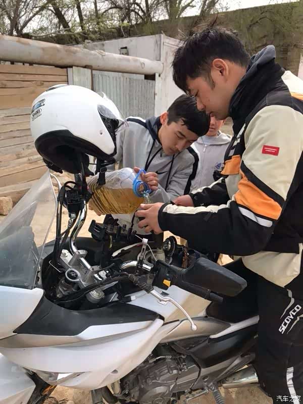 第一天出发雨还不是最大的问题,我们一天都在围绕着怎么加油这个问题。中午到达乌苏市车快没油了,下了高速问了当地人那里可以加油去了给摩托加油的唯一中国石油(需要去派出所开条备案)随后我拿到了传说中的加油条,加满油继续出发。这会雨已经停了,不过4月中的新疆还是冷。