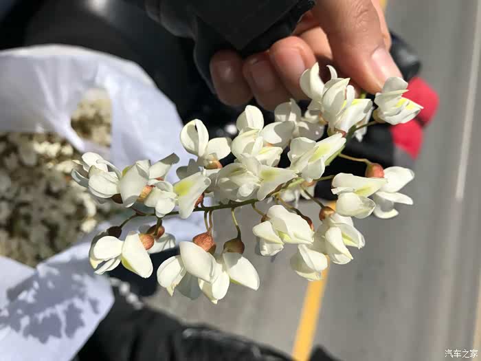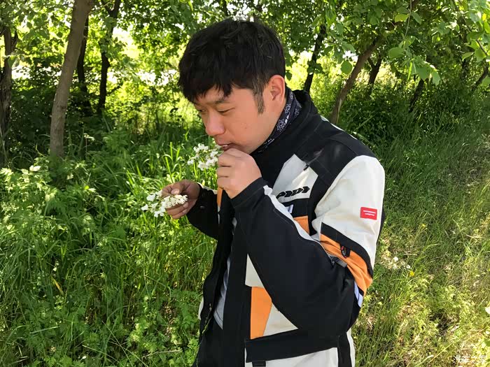 别过好心的老板后继续出发,驶出山区,进入阿国平原,一股熟悉的香味透过头盔扑面而来,这是什么香味??好像是槐花!!槐花?真的是槐花!!见到槐花我们很兴奋!因为每到4.5月份陕西人都会摘槐花,做槐花麦饭,这熟悉的香味让我们想起了远方的”西安小吃” 二话不说,车停到了路边,找了颗满挂槐花的槐树和媳妇摘起了槐花(只摘花不破坏树枝)时不时有车从我们身边路过看着我们,应该是觉得诧异吧,哈哈(对于阿国人槐花只是用来欣赏的)