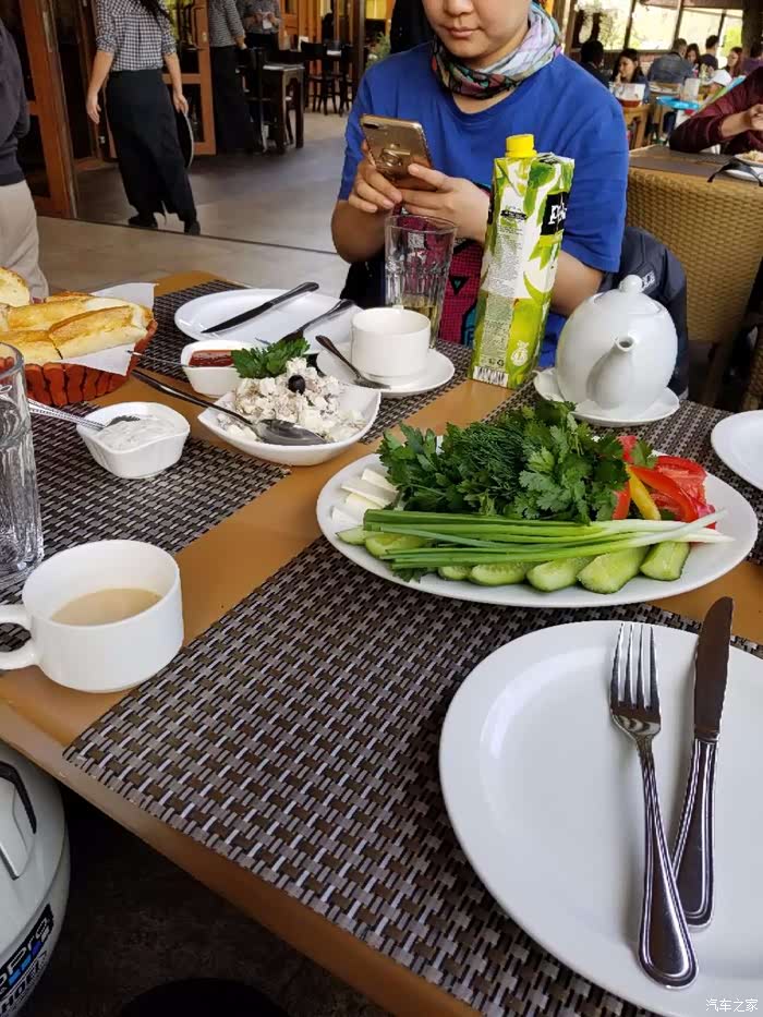 进入山区气温也随下降了很多。要提醒大家的是,阿塞拜疆山区道路路况虽然很好,但是陡坡回头弯居多自驾的朋友一定注意安全。大概到中午12点左右在山上一个KAFE店休息(KAFE其实与国内的服务区餐厅相同)我们没打算消费只是想歇歇,老板应该是很少见到骑摩托的黄种人,很热情的招待我们去店里休息,语言不通,手势比划着要不要喝茶吃些东西,我们也不饿谢谢了他的好意。问我们从哪里来,答道:“CHINA”显得很吃惊,能理解他说的意思是第一次见到骑摩托来这里的中国人。