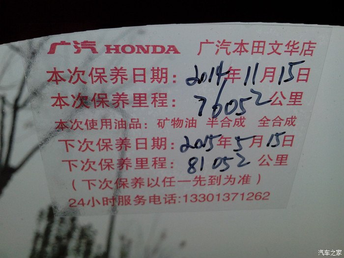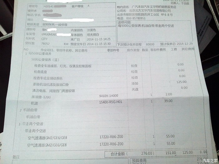 上次(2014年9月17日)7万公里保养之后,我锋范在国庆节期间跑了趟河南。其中去开封半日游还吃了个罚单(说我过路口压着黄线了,100元3分。),回来之后公里数就差不多75000了,昨天到了76000。广本文华店也给我打电话问我到没到公里数(他们按我的保养频次推算的,一般我锋范每两、三个月就去给他们送点钱…… 。
