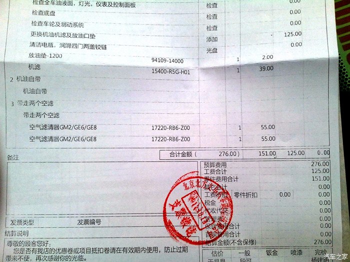 晒单。机油自带,机滤39.垫片2,带走两个空滤55X2 ,工时125。 总计 276元。