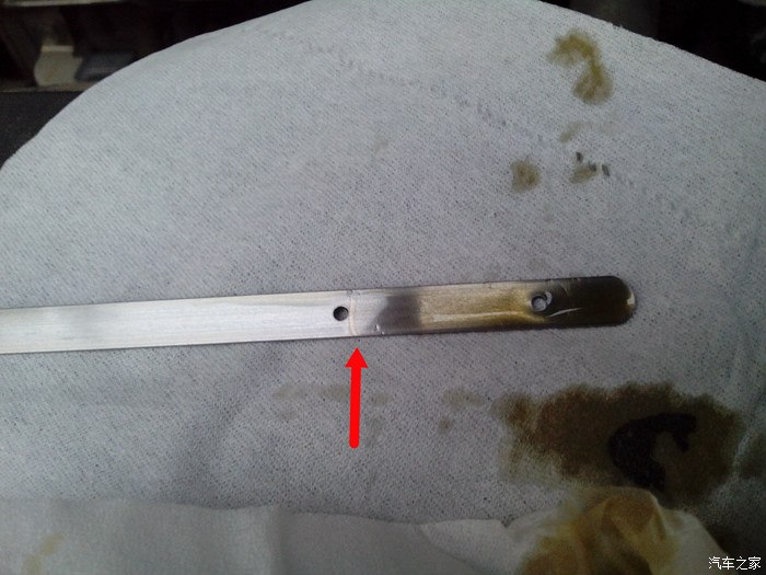 抽油尺看液面。正好到小孔下面,师傅加机油手艺很精准……颜色是反光造成的。请看下一张图。