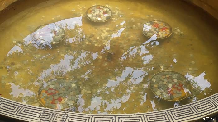 大堂门口中的大铜盆,里面扔满了硬币