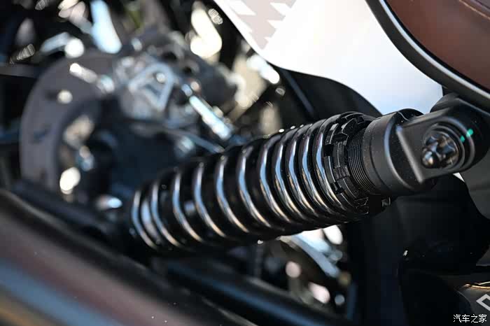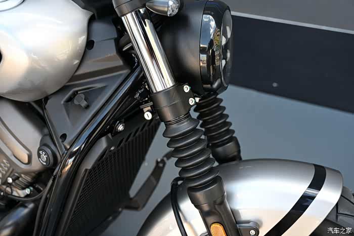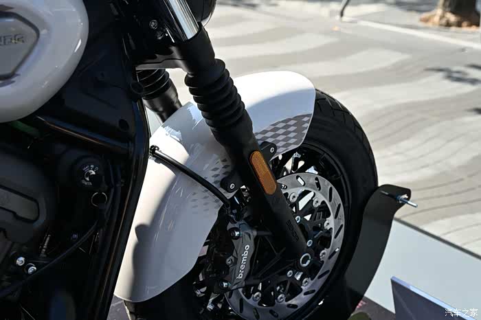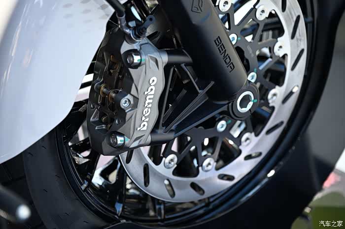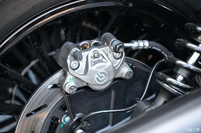 底盘方面黑旗950依旧选用了正立式前减震,同时带有防尘套,当然!这绝对不是奔达想要节省成本,而是想要营造出更加符合巡航的调调,后减震则为双弹簧液压减震。刹车上黑旗950前后刹车均为Brembo,前轮为对向四活塞配双碟盘,后轮为对向双活塞配单碟盘。