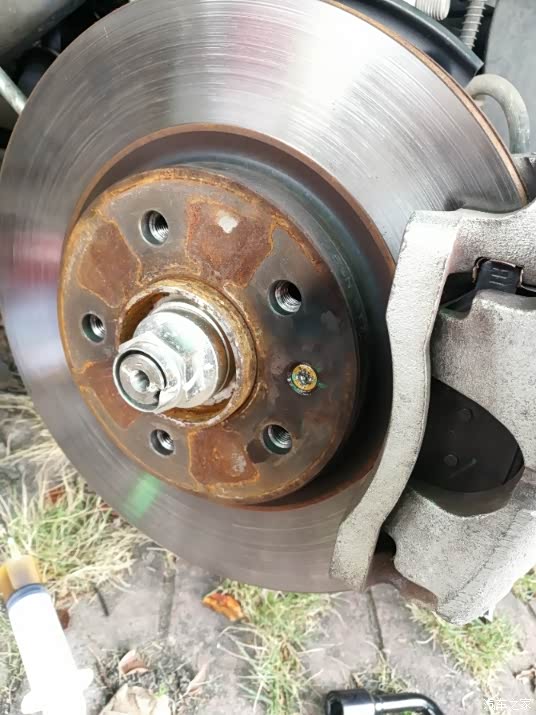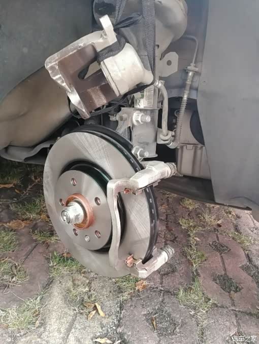 拆完刹车卡钳之后用绳子吊起来,防止损坏刹车油管,原车刹车盘要敲击才能松的。