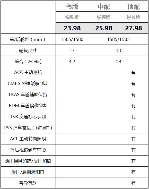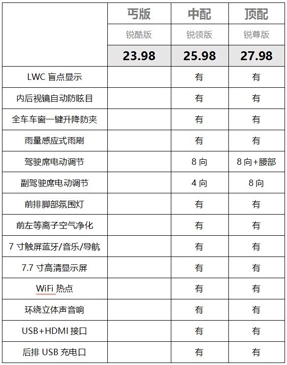 摘要二、中、高配(锐尊/锐领)共有的配置就是“些微智能”+“基本安全”+“丁点酸爽”