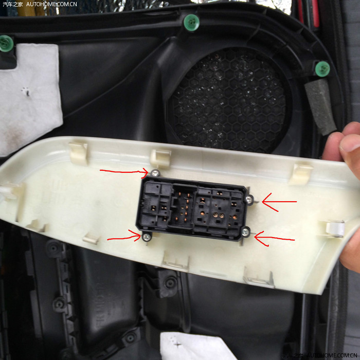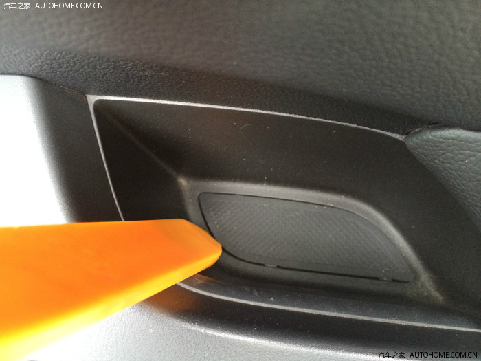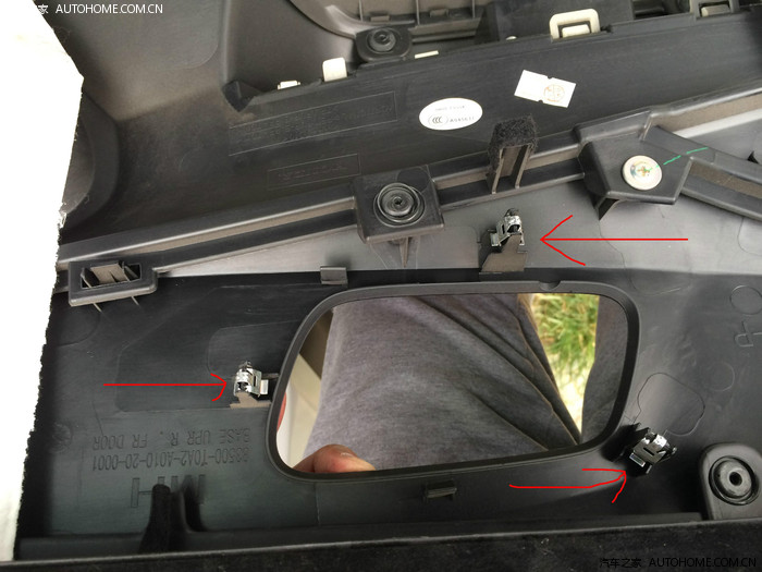 都掰松后 如图两只手把住两侧向上提 注意高音喇叭 斜着点 向上 就能把门板取下了