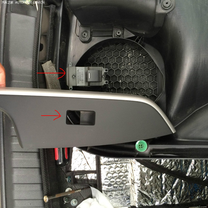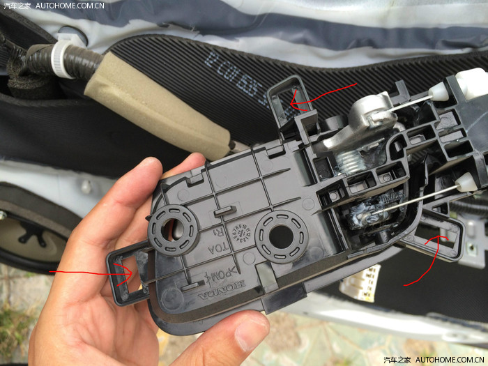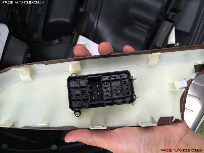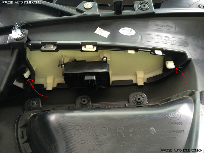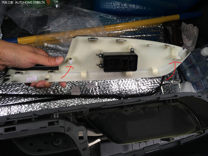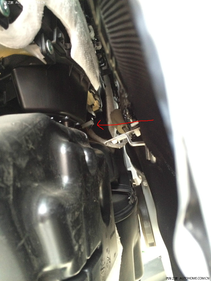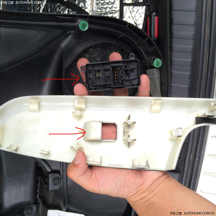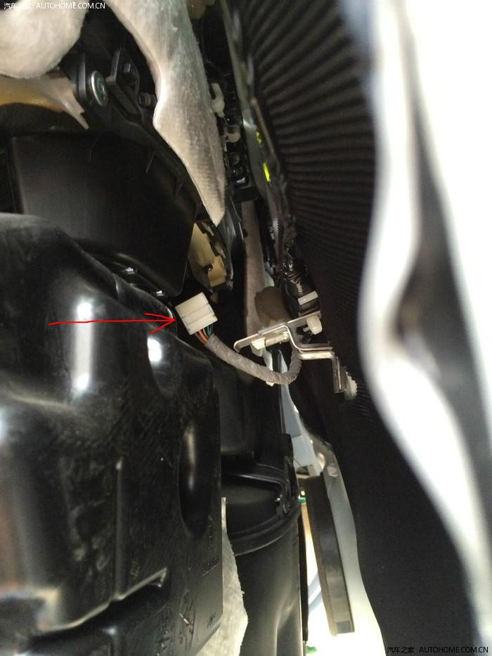 17、箭头所指 白色插头是电动升降玻璃器位置 插头上有个小机关 按住了再拔 一拔就下来了