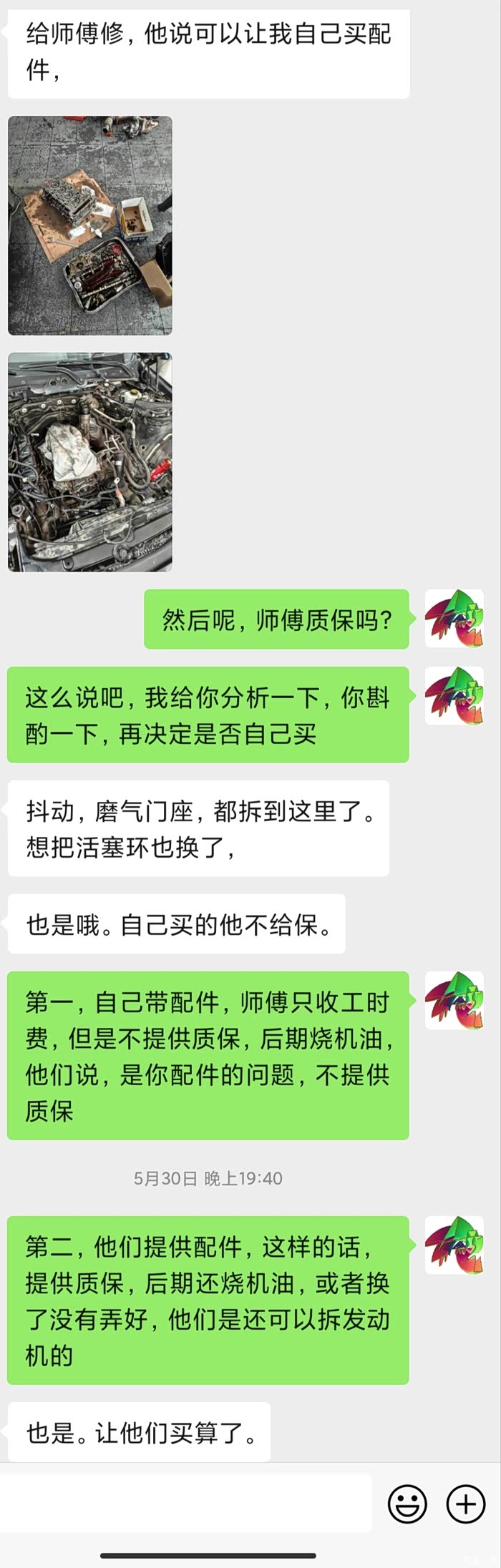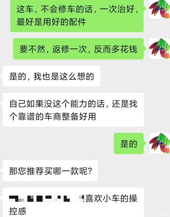 我很感激这位车友,我只是给他分析一下逻辑,他觉得我说的有道理。虽然买他们的配件,会贵一些,但是毕竟是找别人修车,不是自己修车,心里放心一些。