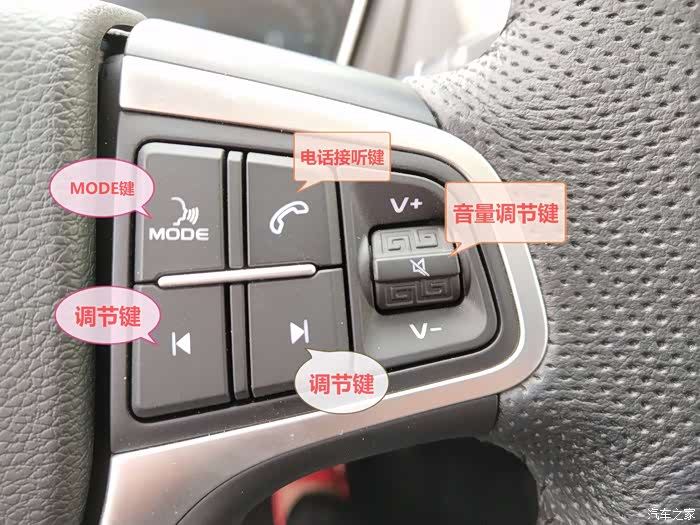 多功能方向盘左边是定速巡航按钮,右边是接打电话和娱乐控制音量控制键。见下图