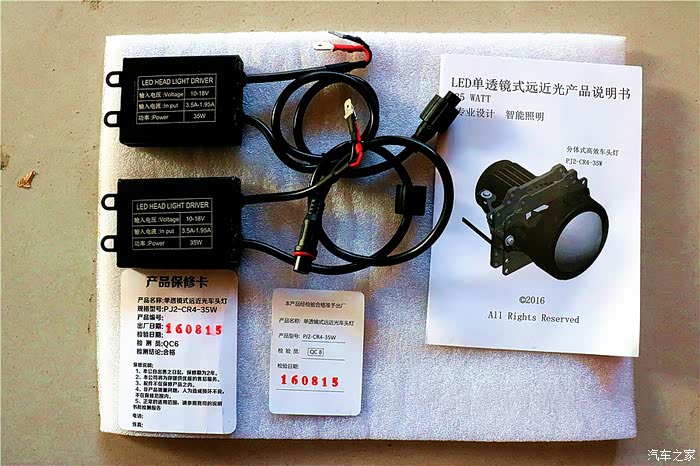 车买来2年来,感觉其他都还算满意的,就是在夜晚行车的时候大灯真的很暗,在城市有微弱的灯光下更是像没开大灯一样,很久就琢磨换一套亮点的大灯,让黑夜行车看的更清楚,也提高了安全度。有车友换了简单的那种疝气大灯(没换透镜),我看到效果也是很一般,所以也迟迟没更换,正在考虑更换双光透镜期间,正好得到某品牌试用LDE大灯名额,很快厂家就寄来全套的LDE双光透镜大灯,绍兴这边没有厂家指定安装点,经过协调安排到义乌免费安装。