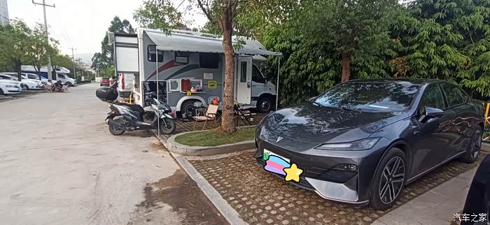 户外野餐,旁边好多房车。 用电方便就是爽