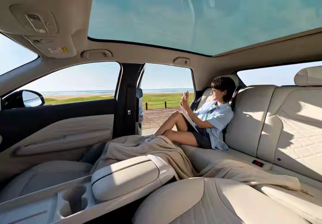 95千瓦电机,40度电,最低续航320公里,全系LED灯,车长4.337米,车内非常宽阔,把前排座椅放倒,无论是午休还是在里面睡上一宿也觉得非常舒服。