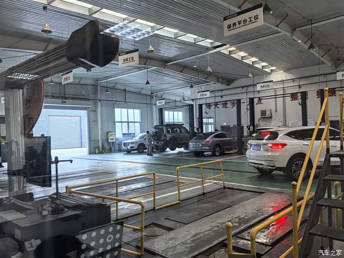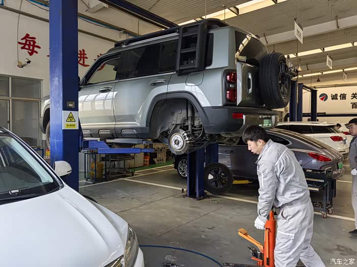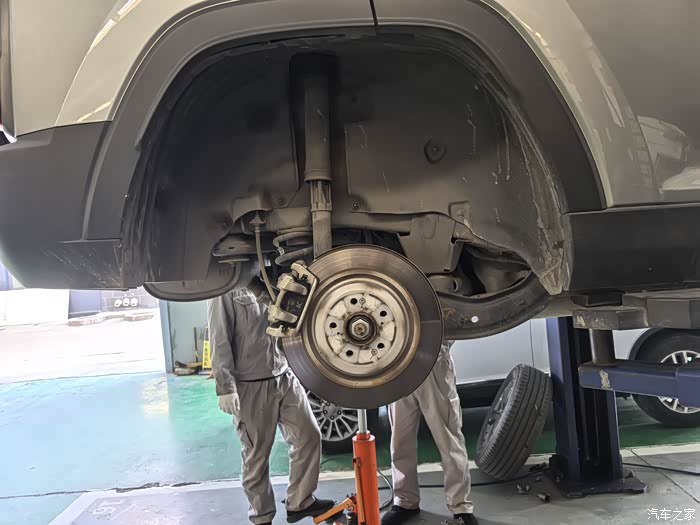 来到4S店,直接把车开到举升机上,不一会就把两个车轮卸了下来。