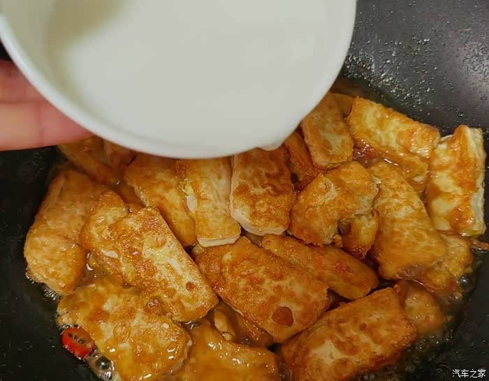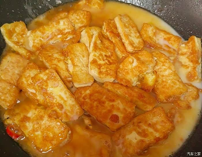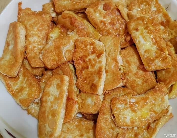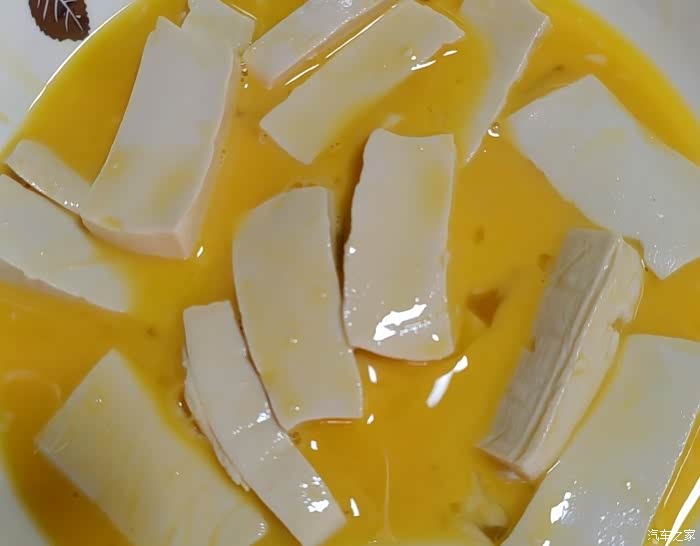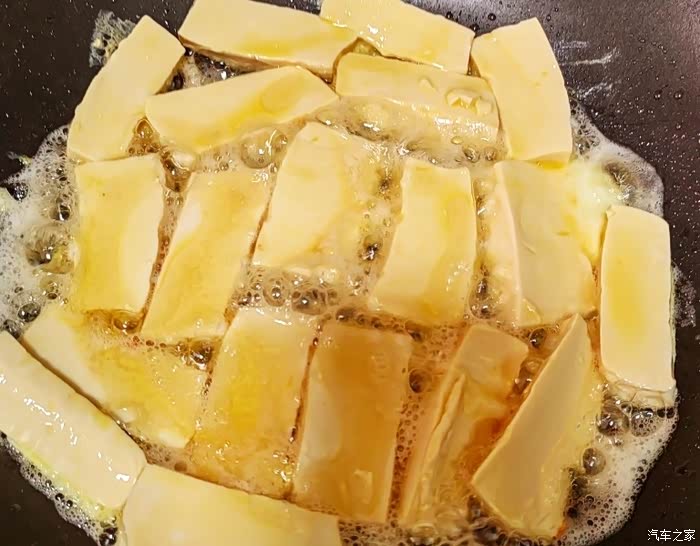 油热放入豆腐薄片,一定要用筷子一片一片的夹起来放到锅里去,不能全部一下子倒下去,如果全部倒下去那个鸡蛋液就会变蛋花了。