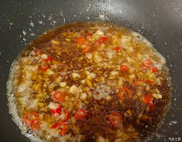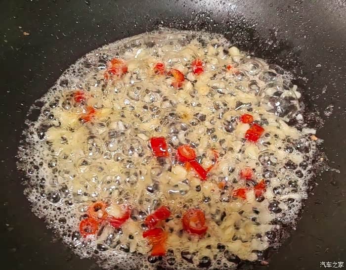 再次起锅烧油,放入蒜末和小米辣炒出香味。