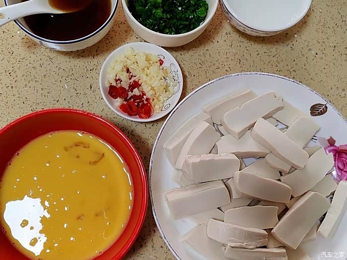 把豆腐切成厚厚的薄片备用,两个鸡蛋打散备用,蒜切成蒜末备用,小米辣切成末备用,碗里放入蚝油、生抽、盐、厨邦鸡粉、白糖、清水调成料汁备用,葱切成葱花备用,水淀粉大半碗备用。