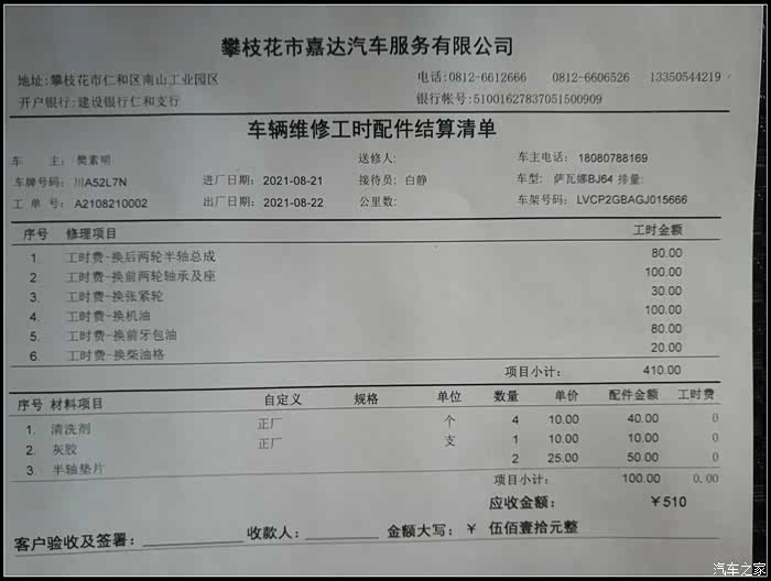 合计下本次修理保养的项目和费用:1、更换2根后半轴总成;2更换前轮轴承总成;3更换涨紧轮;4更换机油和前牙包油。花费不少哦,就工时费就510元,自带的材料2根全新的后半轴轴承,2个前轮轴承总成,涨紧轮,还有各种油水,差不多4000多元的自带备件和材料,合计5000元了