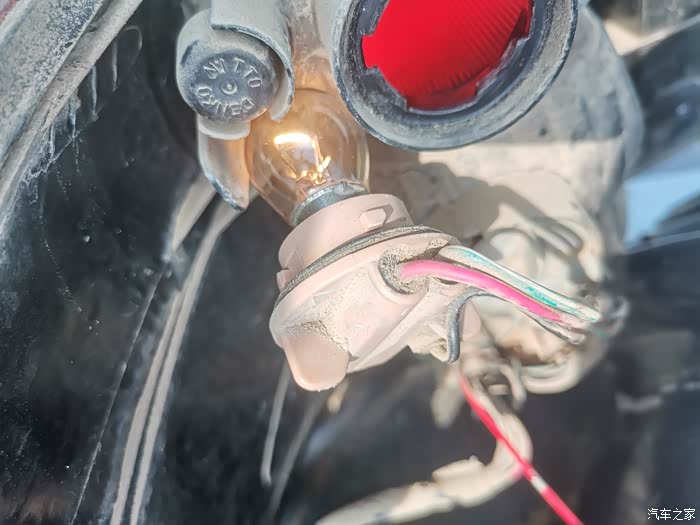 把刹车灯泡插上,打开示宽灯,灯泡亮了,之前有人说示宽灯只有前面有,这个明显不对,重点是灯泡上面的橡胶套上面有电装字样,天语老车用工实在