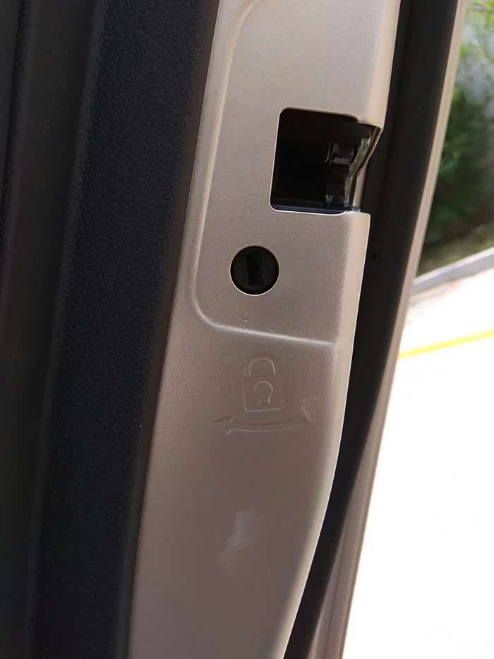 后排车门上的儿童安全锁开关,家里有宝宝的注意一下,根据箭头用钥匙拧一下上锁,反之解锁