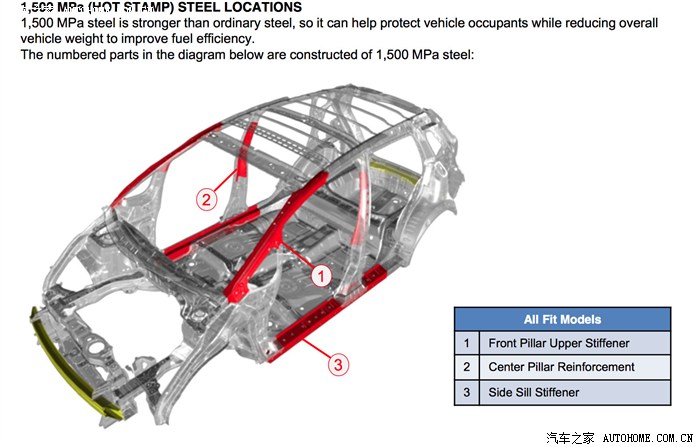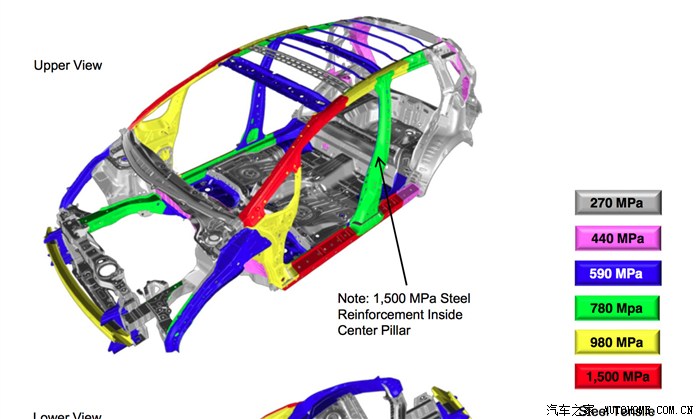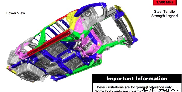 注意B柱位置,这里显示绿色的780MPa钢,我初看有点担心侧面碰撞会不会刚性不够,后来仔细看了下面的Note,发现其实里面还包裹着1500MPa的超高强度钢,应该来说估计B柱成为了全车非常坚固的一个部分。