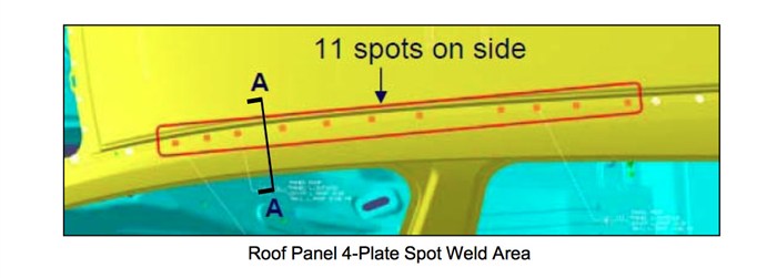 3.在车顶采用了4层材料同时点焊。