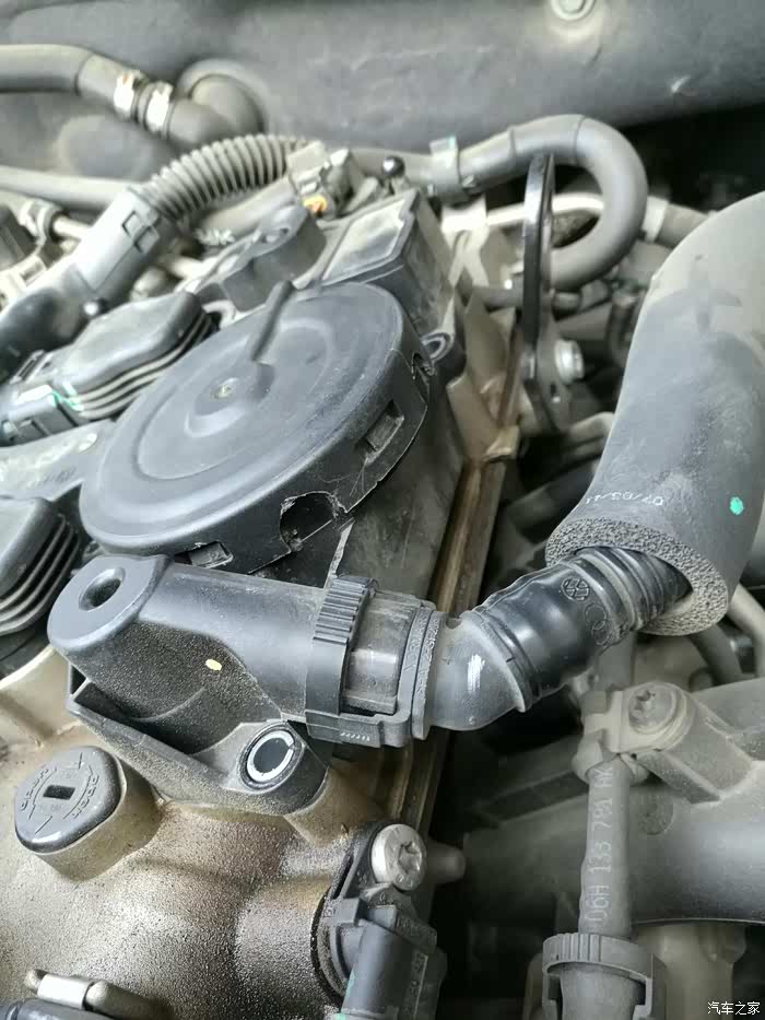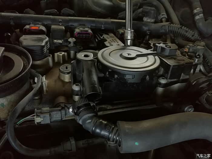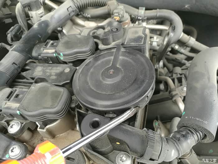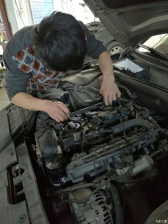 本想按照论坛里其他大侠帖子自己动手拆,无奈工具不称手技术不到位,怎么都撬不开,作罢。后来尝试先把整个废气阀拆下来再慢慢撬圆盖子,但需要把火花塞线圈都拆了,工程量太大,最后还是开到一修理厂请小工帮忙。