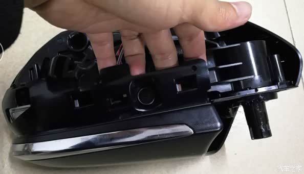 一手握图示位置,另一手握外壳用巧力向上拔(注意可以先用一字刀顶松卡扣位),拆下后视镜下壳