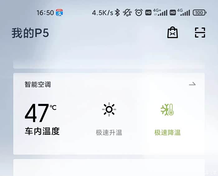 在游玩即将结束的时候,我用手机远程打开小鹏P5的空调,极速降温,此时显示车内温度显示大约47度,简直就是烤房一样。大概5分钟后回到车内,温度非常适宜,马上就能感受到凉爽,还是比较好的。