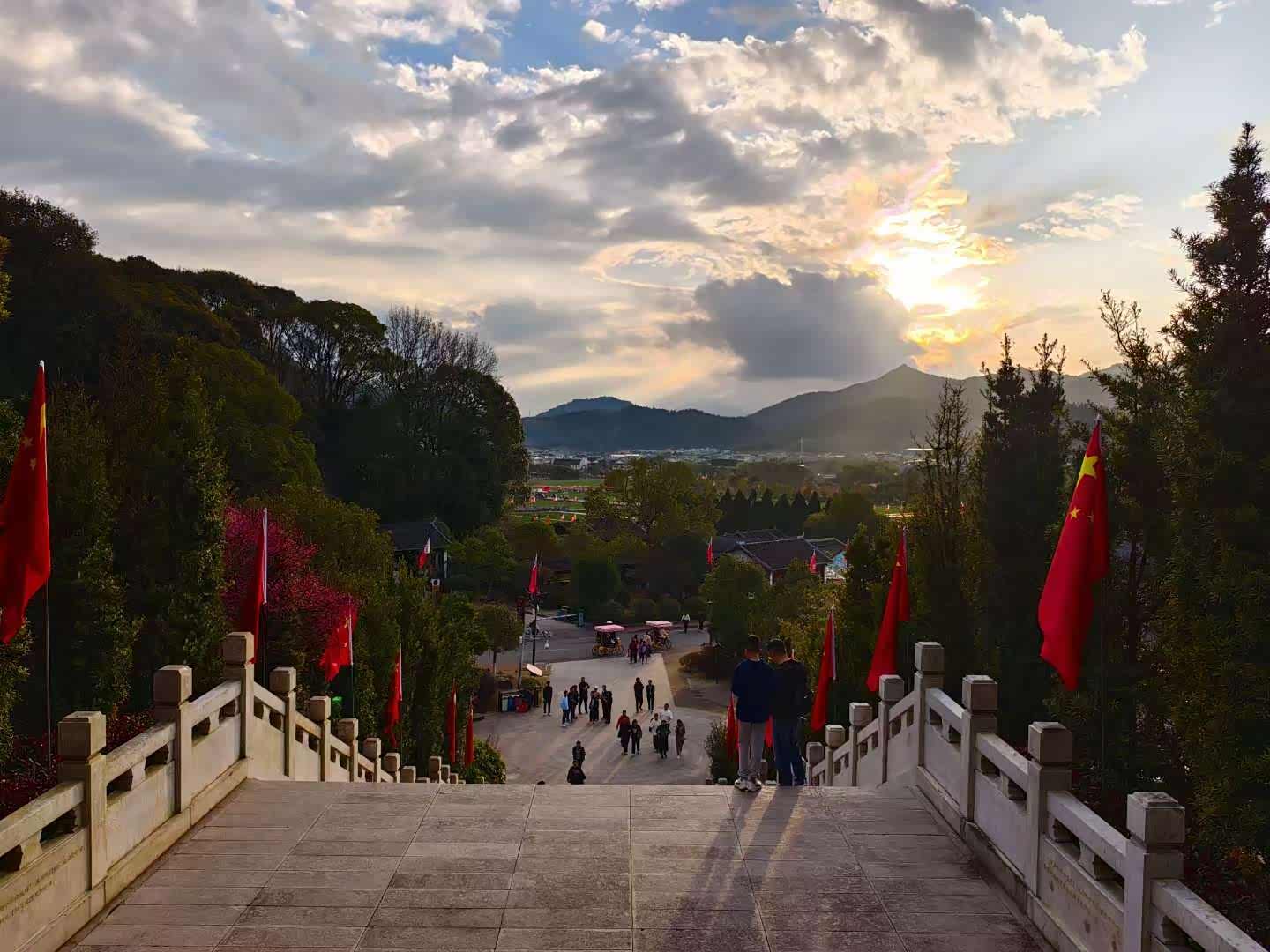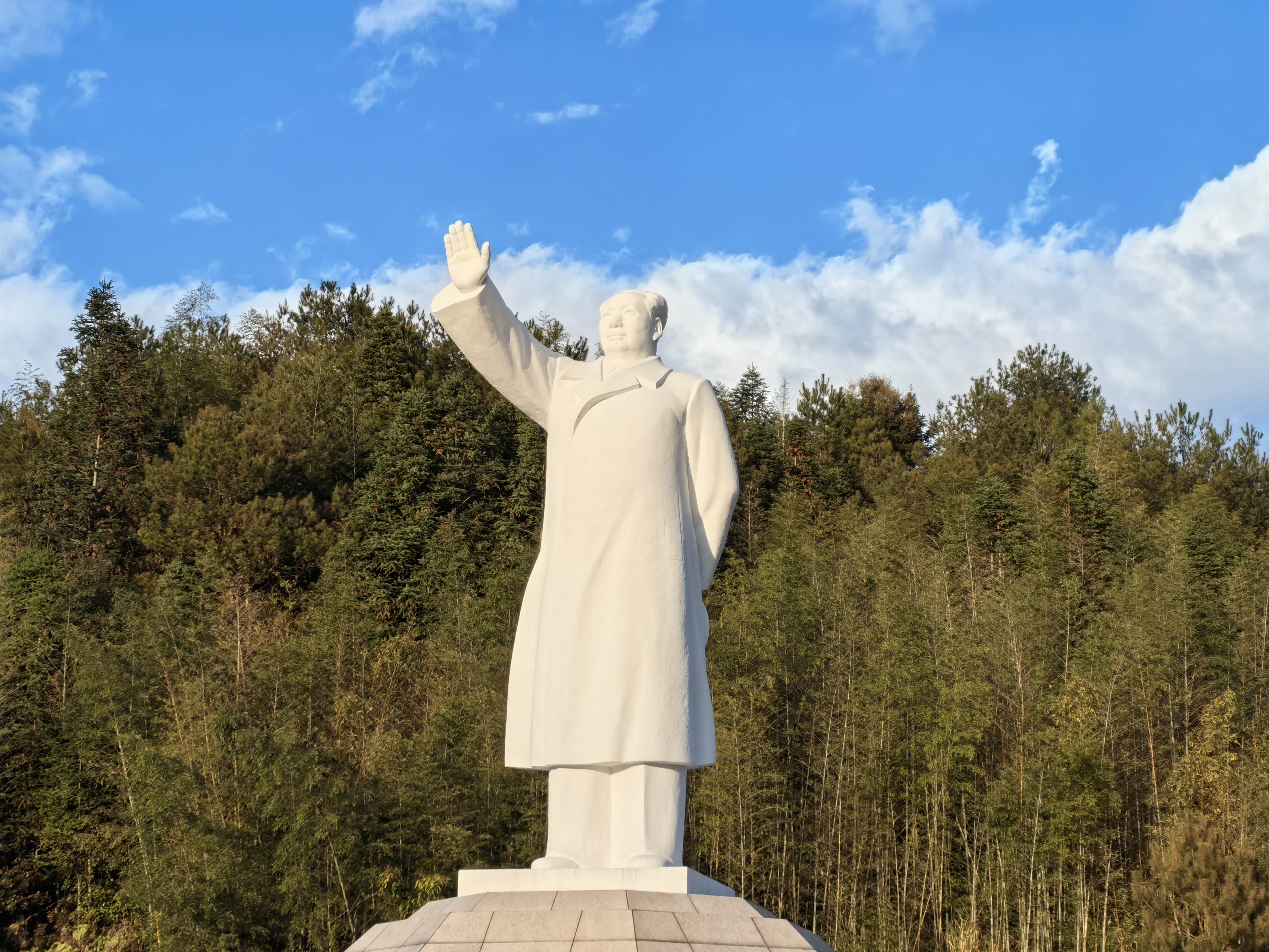 穿过旁边的阅兵场,来到毛主席纪念园。这座纪念园建于小山之上,需要爬一段石阶。山上的主要景观是一尊毛主席雕像,只见他左手后背,右手正挥手致意,双眼目视远方;雕像下方则是毛主席写的诗词。还有古田会议纪念馆,这三处都是免费入园;除此之外还有蜡像馆,想参观需要购买套票。