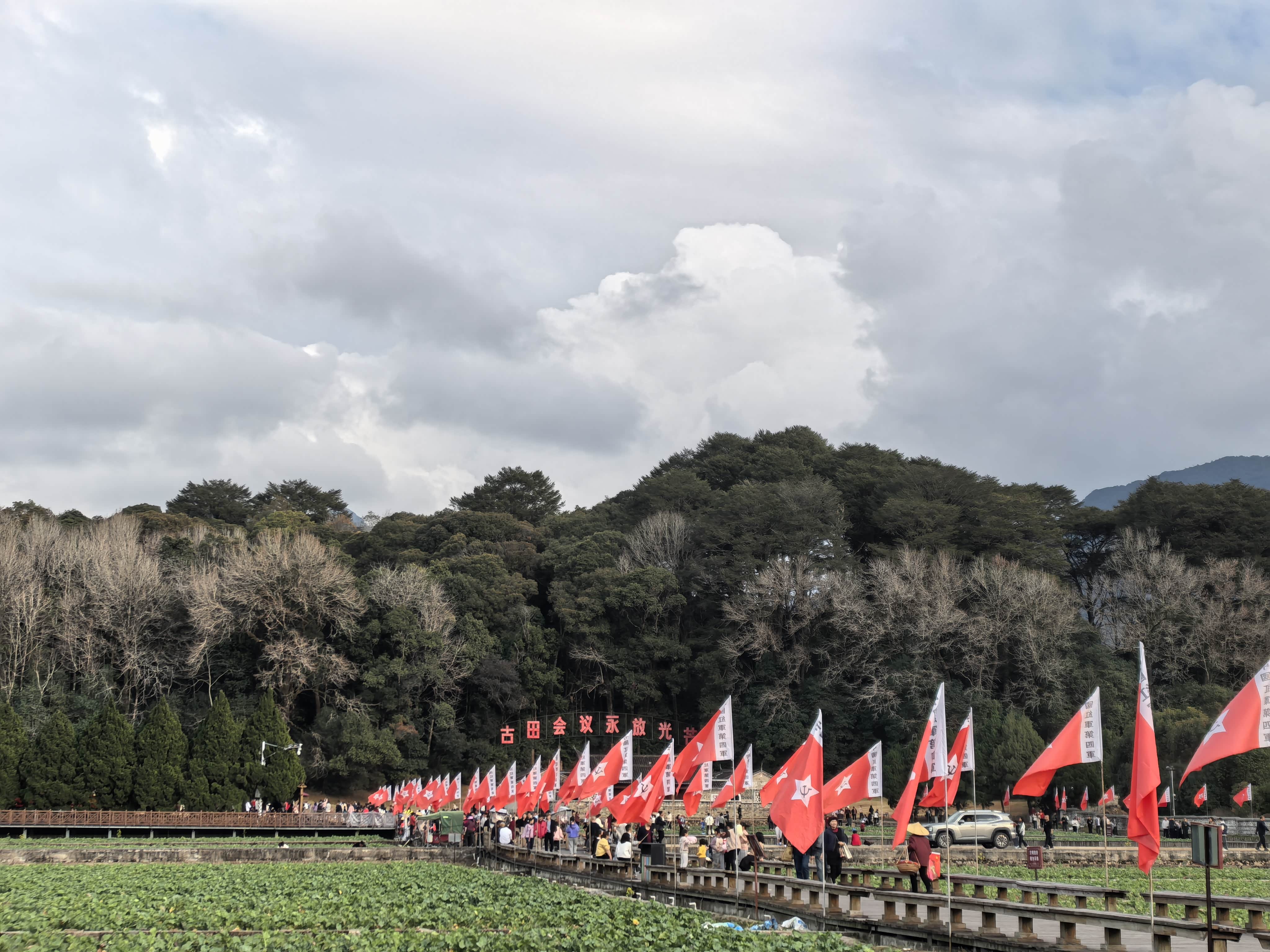 整个会议旧址充满了红色气息,通往旧址的观光路两侧插满了旗帜;与小时候见到不同是旧址前的景色,那时候夏天来是一片向日癸和荷花,这次来则是冬天,可能是一年四季会种植不同的植物展现不同景色。