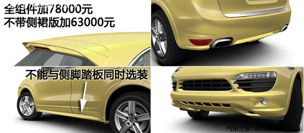 以上介绍的是比较有代表性,用户比较关心的几个外形选装件。而保时捷为卡宴提供的外观选装件还有许多种,这里就不一一介绍了,请参考如下表格: