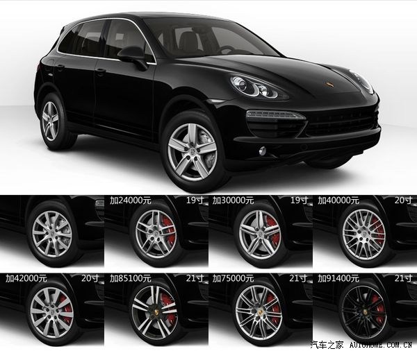 需要注意的是,顶配的Cayenne Turbo S标配的是24000元的那款19寸轮毂,是不需要加价的。所以如果购买的车型是Cayenne Turbo S,那么上图所有选装轮毂的价格都减少24000元,同时不可以选装18寸轮毂。另外,大家应该注意到除了21寸轮毂外,其余的轮毂是不带中间的那枚全彩保时捷盾牌车标轮毂盖的。这项配置需要额外花2700元加装。