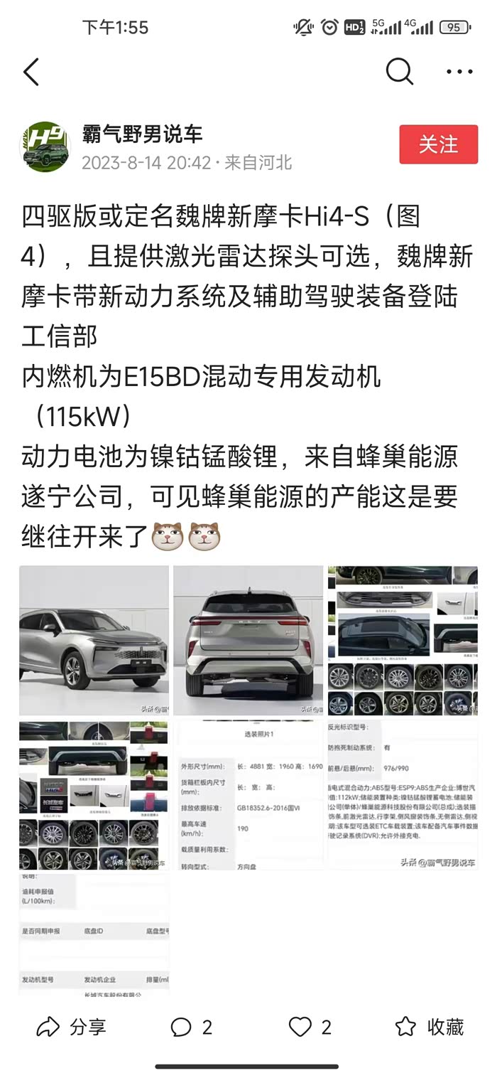 四驱版或定名魏牌新摩卡Hi4-S(图4),且提供激光雷达探头可选,魏牌新摩卡带新动力系统及辅助驾驶装备登陆工信部