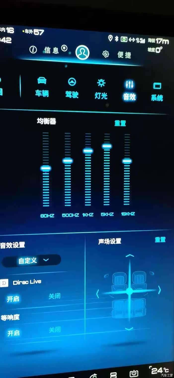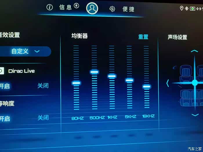 提车1年多,对原厂音响也是听个响的态度,小音量低频纯靠等响度凑,浑浊无力,dirac调音太偏向中置喇叭,声场取决于中控台和前排门板之间,但是中置喇叭又太生硬,小音量不动听声音出不来,关掉dirac又不好听,关了等响度又很单薄,加了dsp之后又调不出dirac的音效,原车12个喇叭,都是20-25W,4欧姆,中置喇叭15W,低音炮2欧25W。