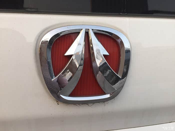 北汽威旺的标志,不锈钢的材质里面红色底色很喜庆,符合中国人的品味