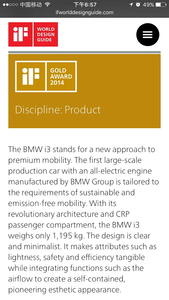 你知道我在等的是什么吗?2014年11月末,被《时代》周刊为2014年25项年度最佳发明,称其为“令电动车变得动人的汽车”的i3!同年又获得了工业产品设计的诺贝尔——德国iF设计“Gold Award”的i3。除了也有四个轮子其他与一切前辈都大相径庭的i3。无与伦比的i3!!!(控制,要控制情绪……)