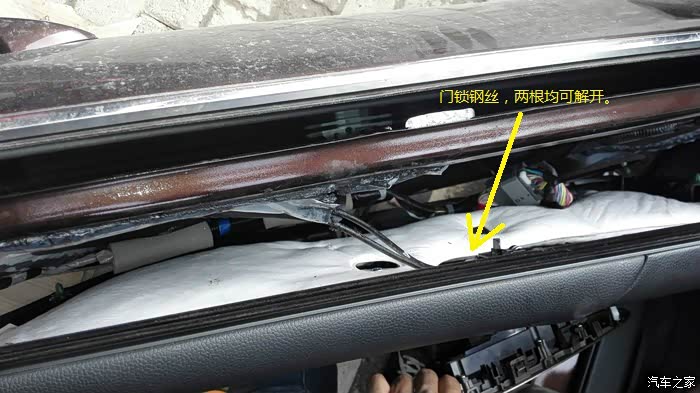 这个时候要注意,因为还有两根门锁铁丝连在门板上的,要解开铁丝和控制面板电源线的线卡子,才能完全移走内饰门板。