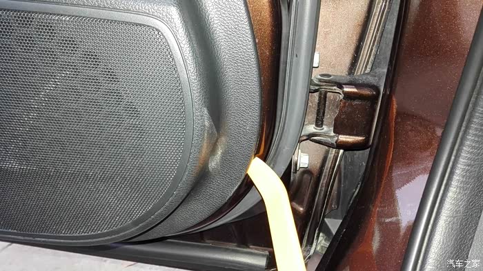 螺丝清除后,首先用撬棒撬开车窗角落的音响盖子,里面没有螺丝,撬开扳下三角形面板,然后解开连接喇叭的电线卡子。