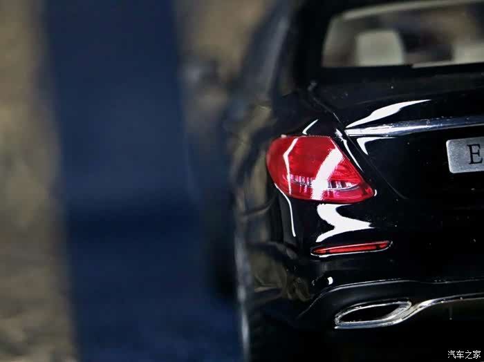 来到车模的正尾部,E级的整体设计依然延续了奔驰的家族式设计风格,圆润典雅,没有一丝拖泥带水的意思,但做工我觉得还是有待提高的,比如两侧尾灯灯罩有不对称的情况,后备箱尾门上的镀铬饰条也有掉漆的现象发生,还有就是后备箱门无法立住,比较可惜。